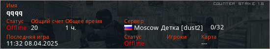 Играет на Counter Strike 1.6 сервере. Страна: РоссияПервый раз замечен 15:24 01.09.2021