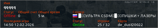 Играет на Counter Strike 1.6 сервере. Страна: РоссияПервый раз замечен 14:48 12.02.2026