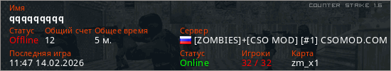 Играет на Counter Strike 1.6 сервере. Страна: РоссияПервый раз замечен 11:45 14.02.2026