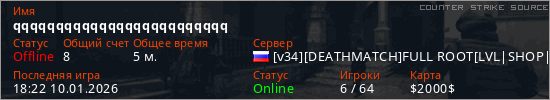 Играет на Counter Strike Source сервере. Страна: РоссияПервый раз замечен 18:19 10.01.2026