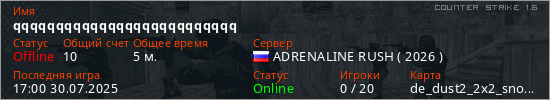Играет на Counter Strike 1.6 сервере. Страна: РоссияПервый раз замечен 16:29 30.07.2025