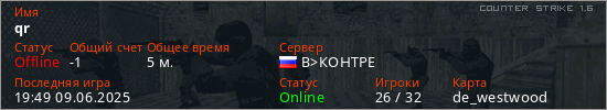 Играет на Counter Strike 1.6 сервере. Страна: РоссияПервый раз замечен 19:40 09.06.2025