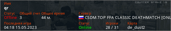 Играет на Counter Strike 1.6 сервере. Страна: РоссияПервый раз замечен 00:55 13.05.2023