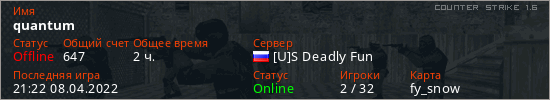 Играет на Counter Strike 1.6 сервере. Страна: РоссияПервый раз замечен 22:52 12.03.2022