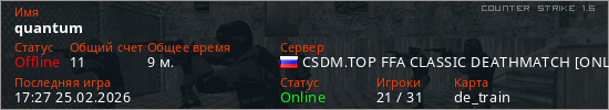 Играет на Counter Strike 1.6 сервере. Страна: РоссияПервый раз замечен 00:30 25.02.2026
