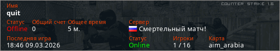 Играет на Counter Strike 1.6 сервере. Страна: РоссияПервый раз замечен 18:43 09.03.2026