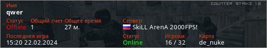 Играет на Counter Strike 1.6 сервере. Страна: РоссияПервый раз замечен 17:33 05.12.2022