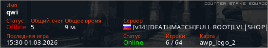 Играет на Counter Strike Source сервере. Страна: РоссияПервый раз замечен 15:15 28.02.2026