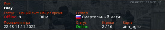 Играет на Counter Strike 1.6 сервере. Страна: РоссияПервый раз замечен 11:15 09.07.2025