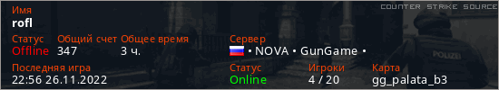 Играет на Counter Strike Source сервере. Страна: РоссияПервый раз замечен 21:54 03.11.2022