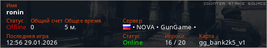 Играет на Counter Strike Source сервере. Страна: РоссияПервый раз замечен 12:48 29.01.2026