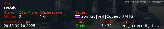 Играет на Counter Strike Source сервере. Страна: РоссияПервый раз замечен 16:12 26.10.2025