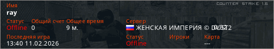 Играет на Counter Strike 1.6 сервере. Страна: РоссияПервый раз замечен 13:26 11.02.2026