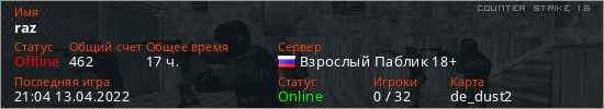 Играет на Counter Strike 1.6 сервере. Страна: РоссияПервый раз замечен 10:09 14.12.2019