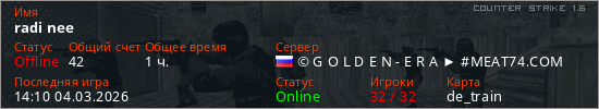 Играет на Counter Strike 1.6 сервере. Страна: РоссияПервый раз замечен 11:03 05.02.2026