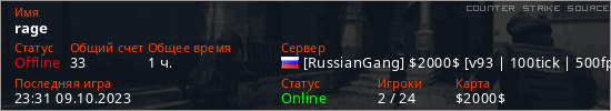 Играет на Counter Strike Source сервере. Страна: РоссияПервый раз замечен 16:12 10.07.2023