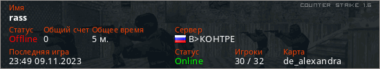 Играет на Counter Strike 1.6 сервере. Страна: РоссияПервый раз замечен 23:45 09.11.2023