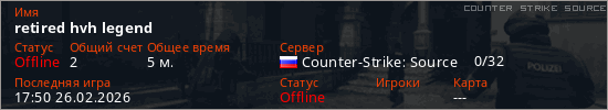 Играет на Counter Strike Source сервере. Страна: РоссияПервый раз замечен 17:37 26.02.2026