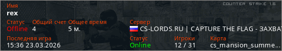 Играет на Counter Strike 1.6 сервере. Страна: РоссияПервый раз замечен 15:34 23.03.2026