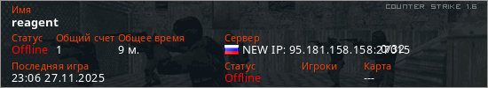 Играет на Counter Strike 1.6 сервере. Страна: РоссияПервый раз замечен 18:04 01.10.2025