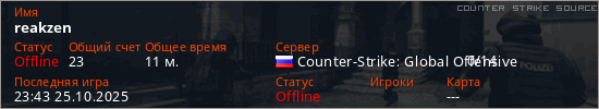 Играет на Counter Strike Source сервере. Страна: РоссияПервый раз замечен 20:15 03.10.2025