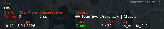 Играет на Counter Strike 1.6 сервере. Страна: ЛатвияПервый раз замечен 10:11 15.04.2026