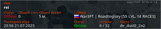 Играет на Counter Strike 1.6 сервере. Страна: РоссияПервый раз замечен 22:50 21.07.2025
