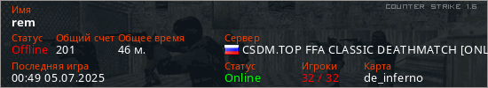 Играет на Counter Strike 1.6 сервере. Страна: РоссияПервый раз замечен 01:08 01.03.2024