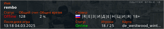 Играет на Counter Strike 1.6 сервере. Страна: РоссияПервый раз замечен 10:45 26.11.2021