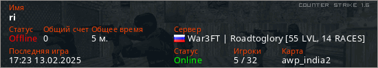 Играет на Counter Strike 1.6 сервере. Страна: РоссияПервый раз замечен 17:21 13.02.2025