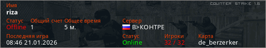 Играет на Counter Strike 1.6 сервере. Страна: РоссияПервый раз замечен 08:25 21.01.2026