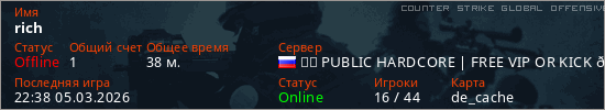 Играет на Counter Strike Global Offensive сервере. Страна: РоссияПервый раз замечен 23:48 09.12.2025