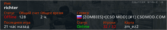 Играет на Counter Strike 1.6 сервере. Страна: РоссияПервый раз замечен 20:25 09.04.2025