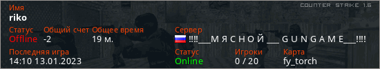 Играет на Counter Strike 1.6 сервере. Страна: РоссияПервый раз замечен 13:54 13.01.2023