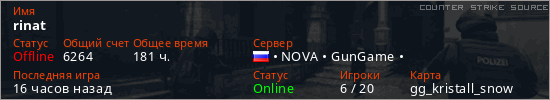 Играет на Counter Strike Source сервере. Страна: РоссияПервый раз замечен 10:27 15.04.2023