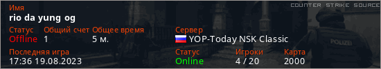 Играет на Counter Strike Source сервере. Страна: РоссияПервый раз замечен 17:33 19.08.2023
