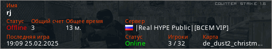 Играет на Counter Strike 1.6 сервере. Страна: РоссияПервый раз замечен 19:12 23.01.2025