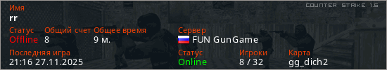 Играет на Counter Strike 1.6 сервере. Страна: РоссияПервый раз замечен 00:37 24.11.2025