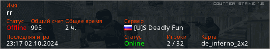 Играет на Counter Strike 1.6 сервере. Страна: РоссияПервый раз замечен 18:30 10.01.2023