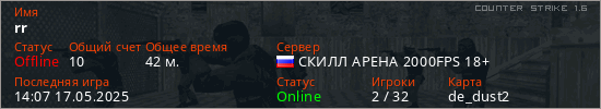 Играет на Counter Strike 1.6 сервере. Страна: РоссияПервый раз замечен 03:23 21.06.2023