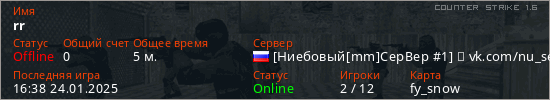 Играет на Counter Strike 1.6 сервере. Страна: РоссияПервый раз замечен 16:36 24.01.2025