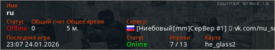 Играет на Counter Strike 1.6 сервере. Страна: РоссияПервый раз замечен 22:51 24.01.2026