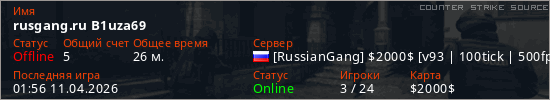 Играет на Counter Strike Source сервере. Страна: РоссияПервый раз замечен 14:34 09.04.2026
