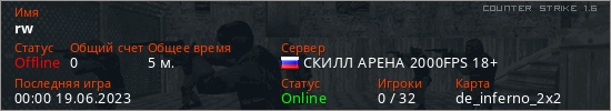 Играет на Counter Strike 1.6 сервере. Страна: РоссияПервый раз замечен 23:47 18.06.2023