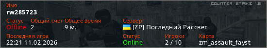 Играет на Counter Strike 1.6 сервере. Страна: УкраинаПервый раз замечен 21:37 11.02.2026