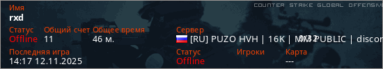 Играет на Counter Strike Global Offensive сервере. Страна: РоссияПервый раз замечен 17:09 06.06.2025