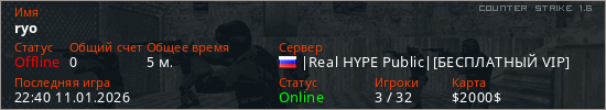 Играет на Counter Strike 1.6 сервере. Страна: РоссияПервый раз замечен 22:38 11.01.2026