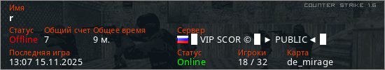 Играет на Counter Strike 1.6 сервере. Страна: РоссияПервый раз замечен 20:46 20.10.2025