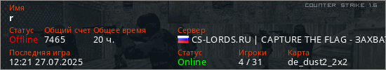 Играет на Counter Strike 1.6 сервере. Страна: РоссияПервый раз замечен 17:35 02.10.2021