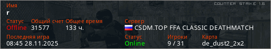 Играет на Counter Strike 1.6 сервере. Страна: РоссияПервый раз замечен 13:22 04.10.2021